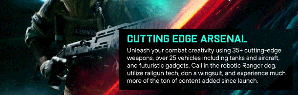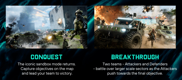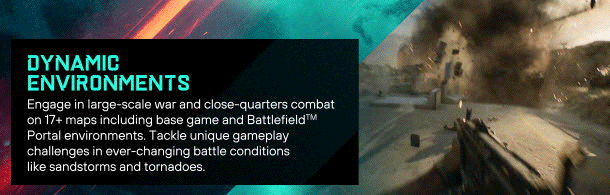 Lead your team to victory in both large, all-out warfare and close-quarters combat on maps from the world of 2042 and classic Battlefield titles. Find your playstyle in class-based gameplay and take on several experiences, including elevated versions of Conquest and Breakthrough. Explore Battlefield Portal, a platform where players can discover, create, and share unexpected battles from Battlefield's past and present.